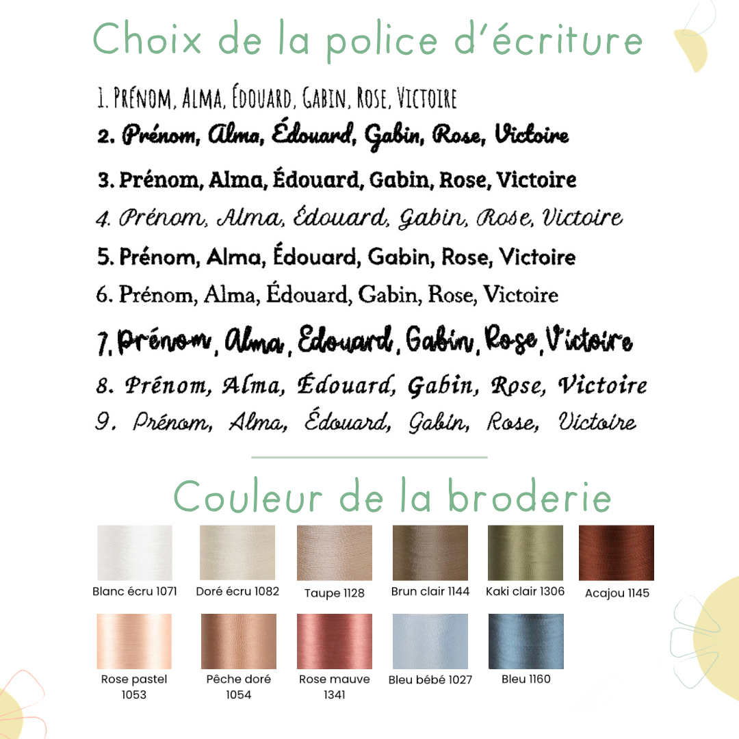 - Choisissez la couleur de la broderie souhaitée - je peux m’occuper pour vous de faire ce choix afin de rendre la création la plus harmonieuse possible ! Dans ce cas sélectionnez « pas de préférence »